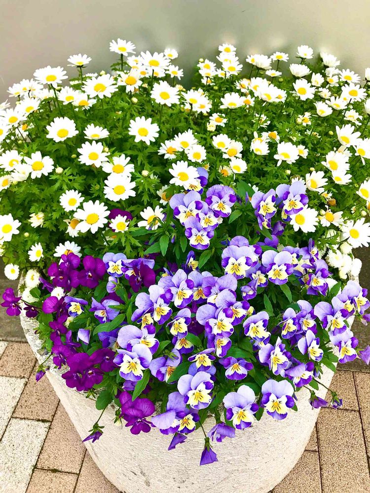 ふんわりボリューミーなパンジー&ノースポールの寄せ植えです💜❤💙💚💛上段の白ᵃⁿᵈイエローと下段のパープル系が爽やかな季節の訪れを告げてますねっ˙꒳˙)♡