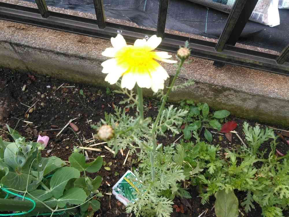 プランターで育てている春菊ですが、花芽が最初に付いた1本だけを摘まずに残して置いたら、背が高くなり過ぎてビニールハウスの天井が閉められなくなりそうなので、1本だけを庭に植え直しました🌼