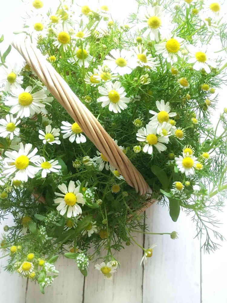 カモミールほんとに可愛いですよ。花瓶ごと籠に入れて