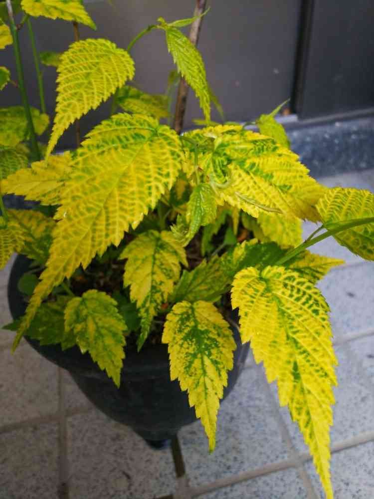 ちょっと変わった色合いの斑入りの八重咲きヤマブキです。