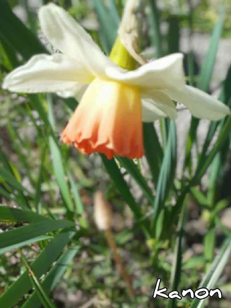 この水仙、つくしに励まされたみたいで今は胸を張って上向いてるんだよ😃