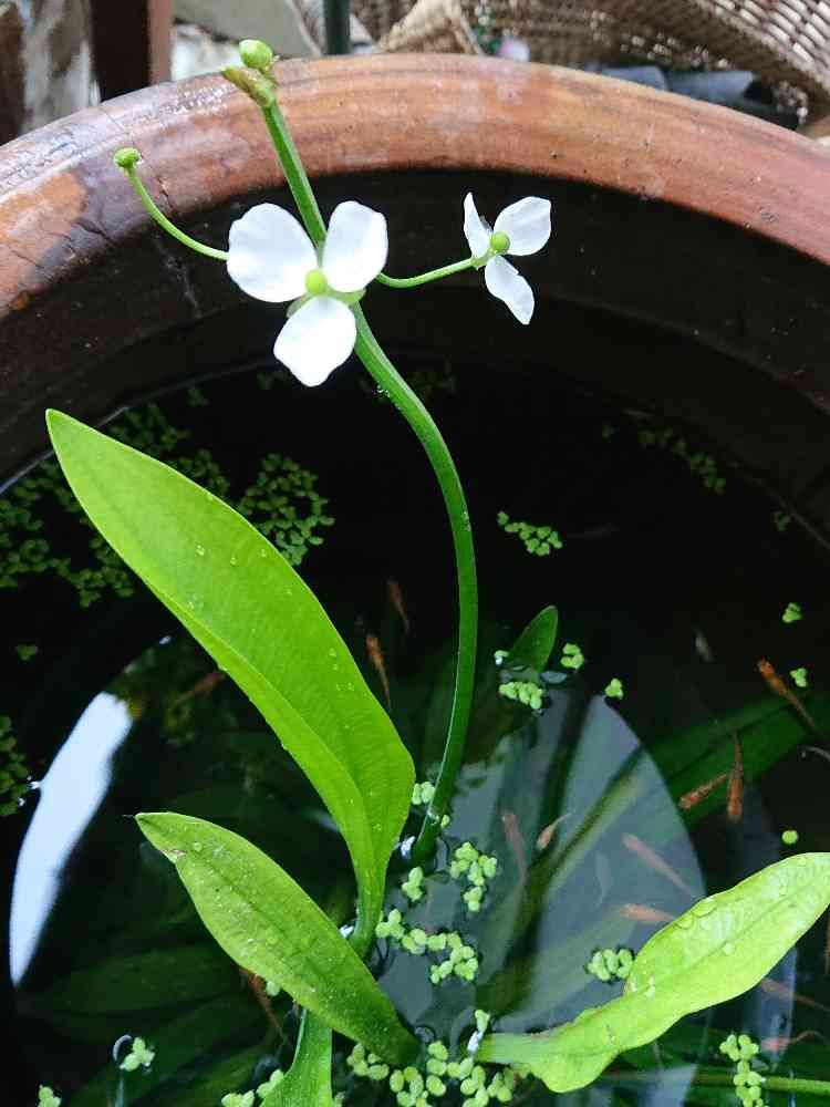 実は、最近購入したナガバオモダカの花が咲いたので今日アップしたのでした♪睡蓮鉢にあると涼し気な雰囲気になりますよね(^^)
