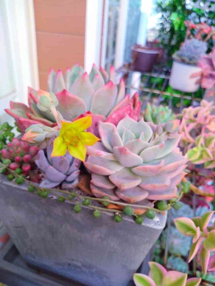 モニターで当たった鉢と土を使って寄せ植えした多肉ちゃんに黄色いお花💛が咲いたよ( ´艸`)✨