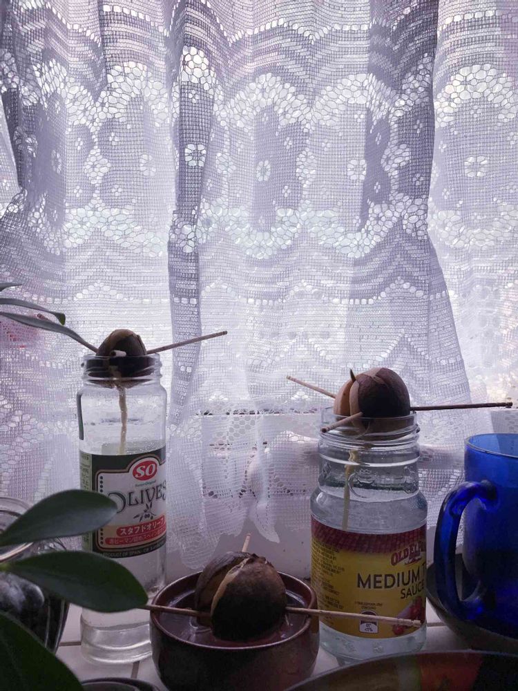 アボカド3兄弟。ピョコっと芽が出てきました🌱