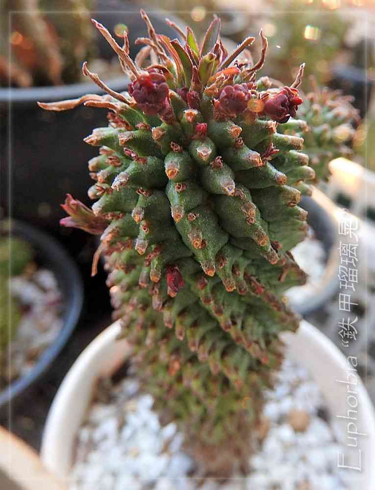 ユーフォルビア・鉄甲瑠璃晃。峨眉鉄と似ているけど、名前を信じるなら交配している種類が違う。峨眉鉄と比べると背が高いし、表面の凹凸もちょっと違う。葉の出方も遅い……でも、去年は2月に葉っぱなしの状態でやってきて、今と同じくらい葉が出たのが7月だったから、それと比べるとずっと早い。