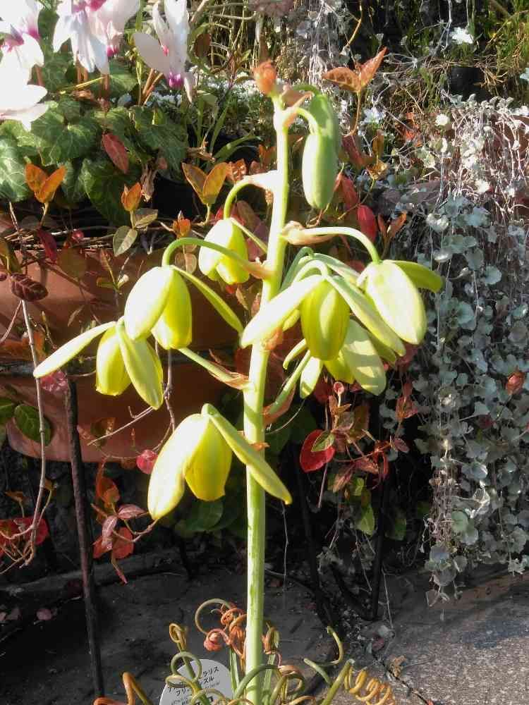 4.29の写真から。アルブカの花が、かなり咲きました。(^-^) でも、肝心の葉の先が茶色くなってます。