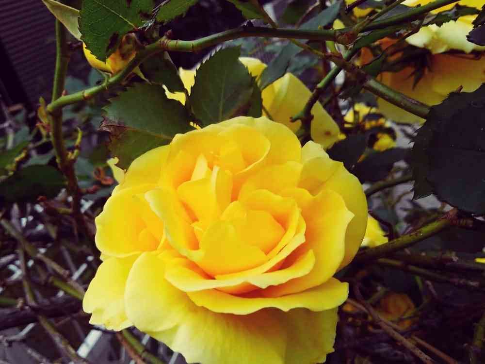 隣の塀の鉄格子から飛び出して咲いている黄色い