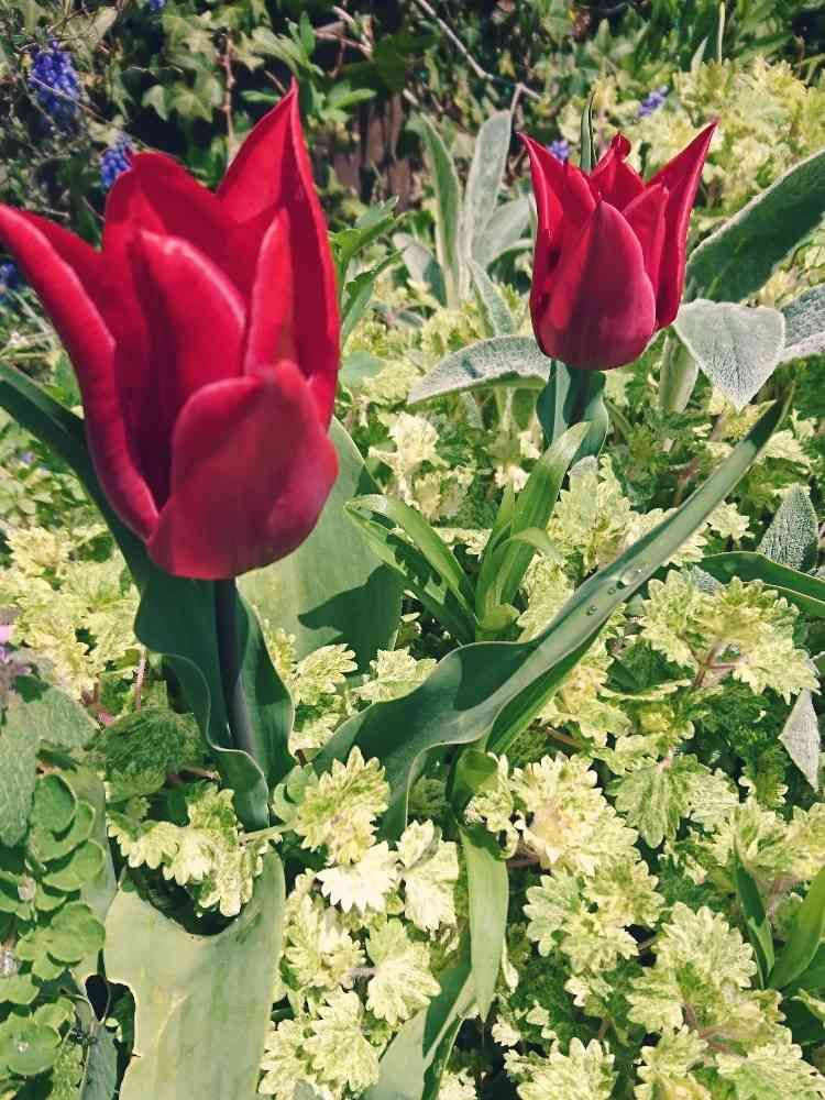 グリーンカーペットの中から 真っ赤なチューリップが 本日も元気に咲いてます😉👏🌷