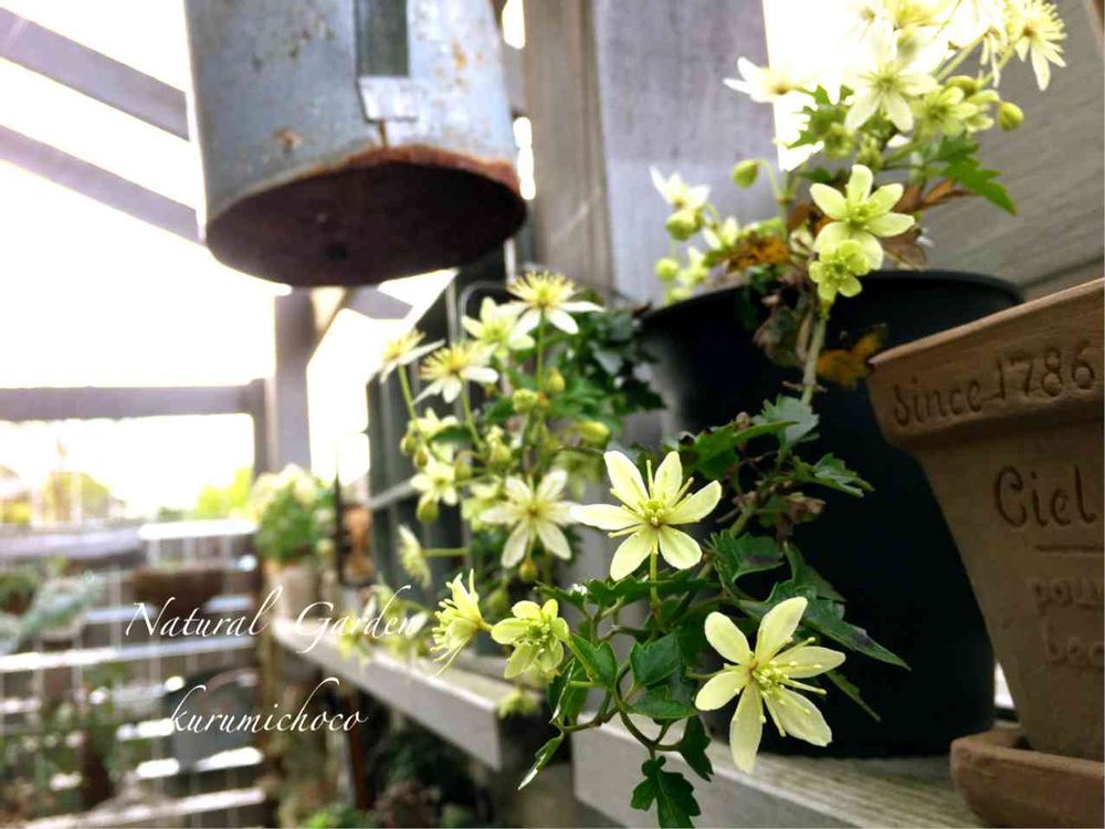クレマチスでも、この小さなクリーム色やグリーンの色彩がとっても好きです