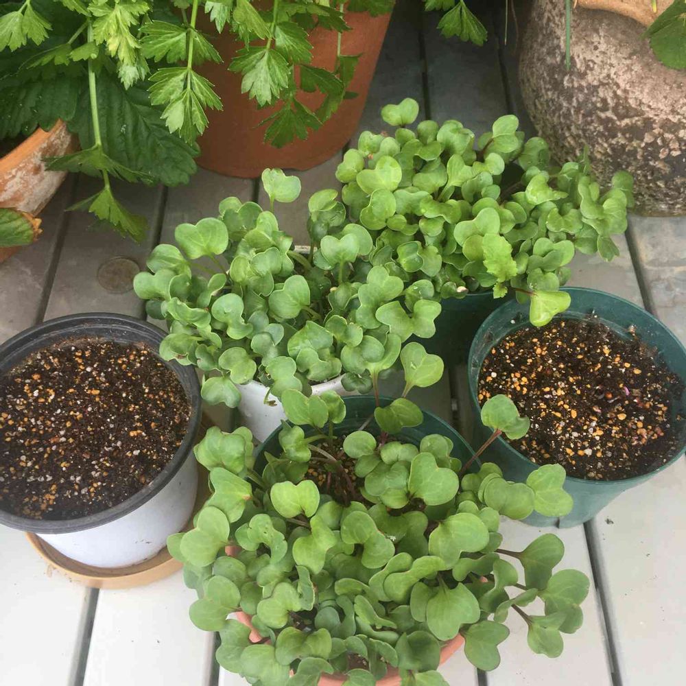左鉢は昨日収穫し種まきしました。右鉢はもう芽が立ち上がり始めました。この時期は早いです。
