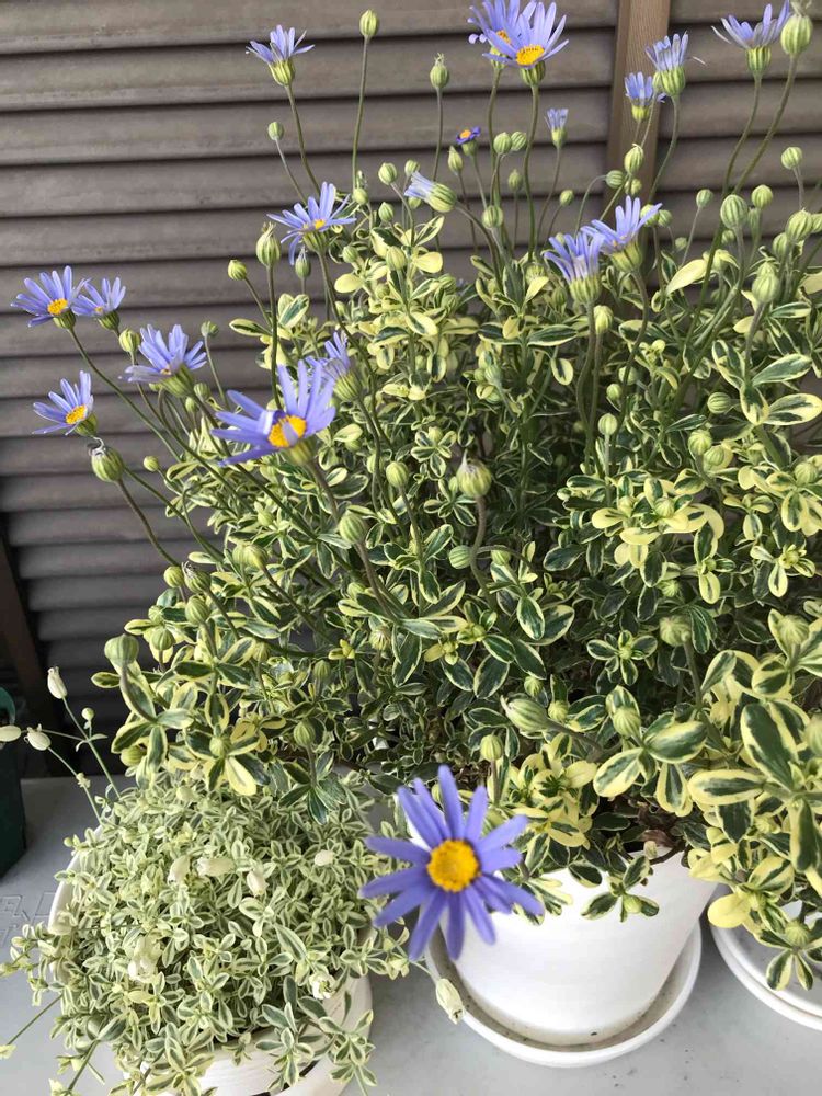 4月にも載せた斑入りのブルーデイジー。いよいよ花が増えてきて感無量😭