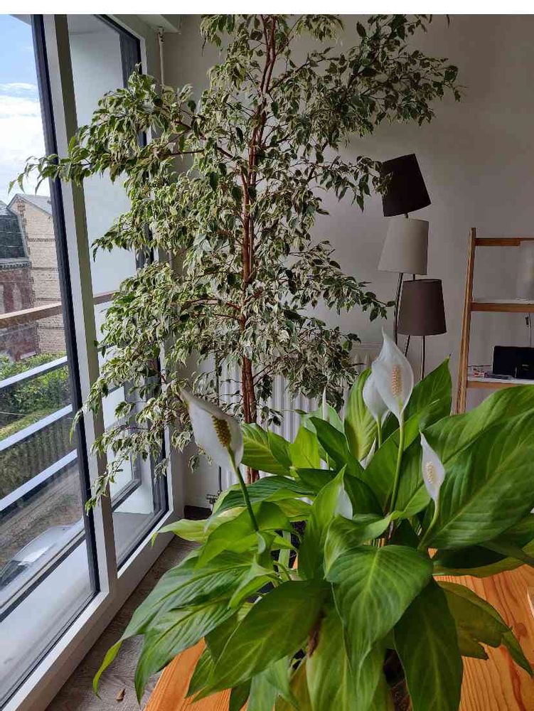 斑入りベンジャミンとお花はスパティフィラムですね。