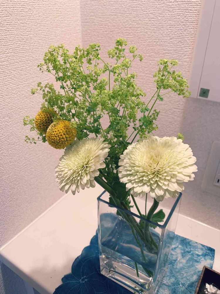 「みどり→アルケミラモリス、黄色→クラスぺディア(ゴールドスティックとも)、白→ガーベラ」かも!