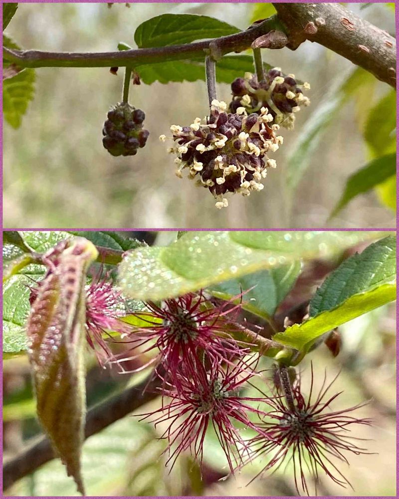 雌花は柄が短く、直径約5mmの球形で、赤紫色の花柱が目立つ←(花柱しか見えない(≧∀≦))