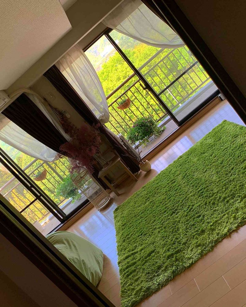 グリーンのラグが、意外に外の景色にマッチすると写真を撮って気づきました🥰