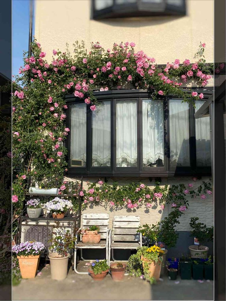 素敵ですね💓ですね~💓 窓を囲むように咲き乱れる薔薇🌹 誘引を考えると努力の賜物ですね(´ー`)💕