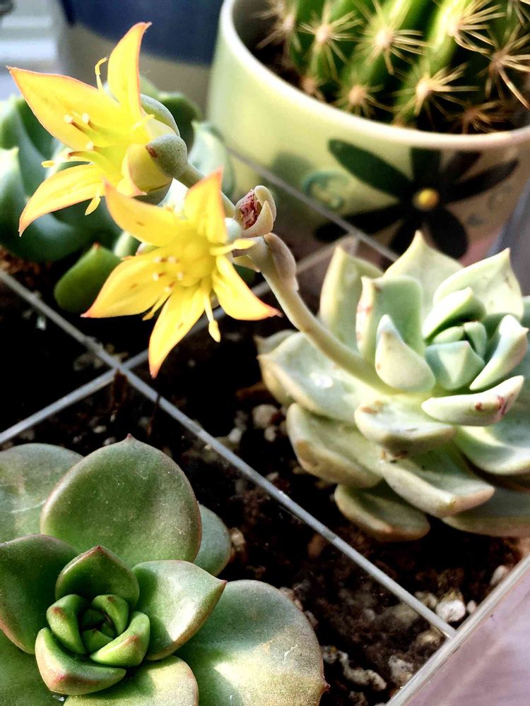 白牡丹が知らないうちに咲いていました。多肉1年目で色々なパターンの花芽が見られて楽しい(*´-`*)