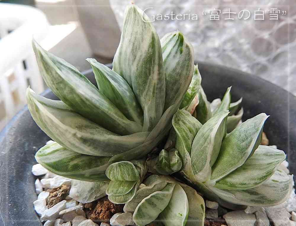 ガステリア・富士の白雪。ネットで見たのよりは緑が多い感jじだけど、白さと質感がいい感じ。我が家にやってきたころと比べると葉が増えてる。生長が遅いと聞いているけど、そうでもないと思う。