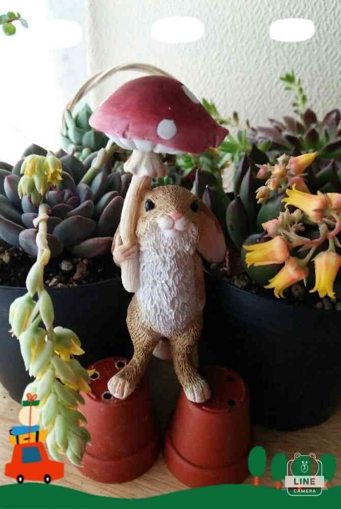 多肉より前に出して 今日はキノコの傘さしたウサギちゃんが主役だよ~❣