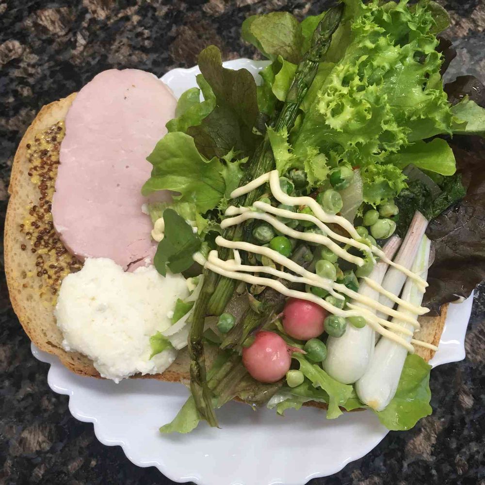フリルレタス、赤レタス、エンダイブ、アスパラガス、グリーンピース、エシャレット、太胡瓜ピクルス、二十日大根浅漬け、と自家製パン、カッテージチーズ、ハムのサンドイッチ。