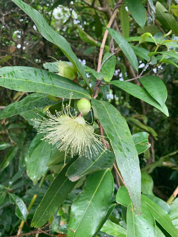 濃いピンク色か赤の花が咲いて、実も楽しめる、エキゾチックな樹木。