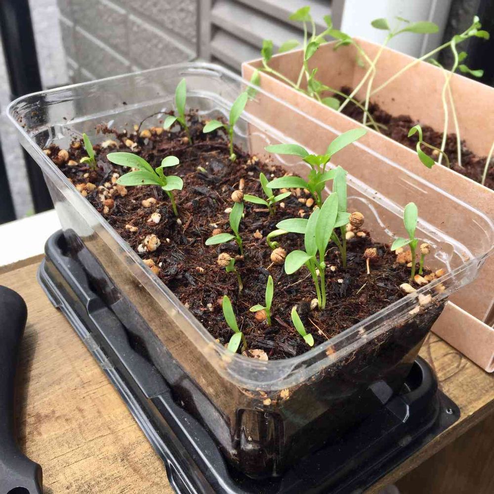 こちらは同じ日に種まきをし、ずっと軒下に置いていたものです。芽が出るのは遅かったですが、しっかりとした茎が育っているようです。