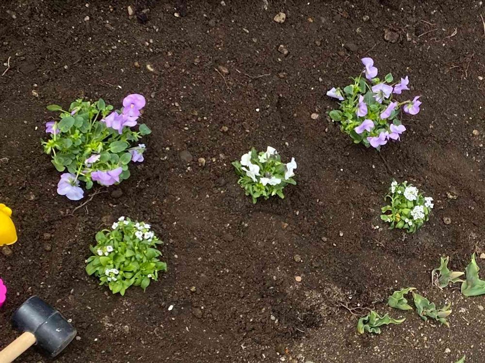やっと晴れたので、玄関にしまっておいたお花を植えつけ〜🌼