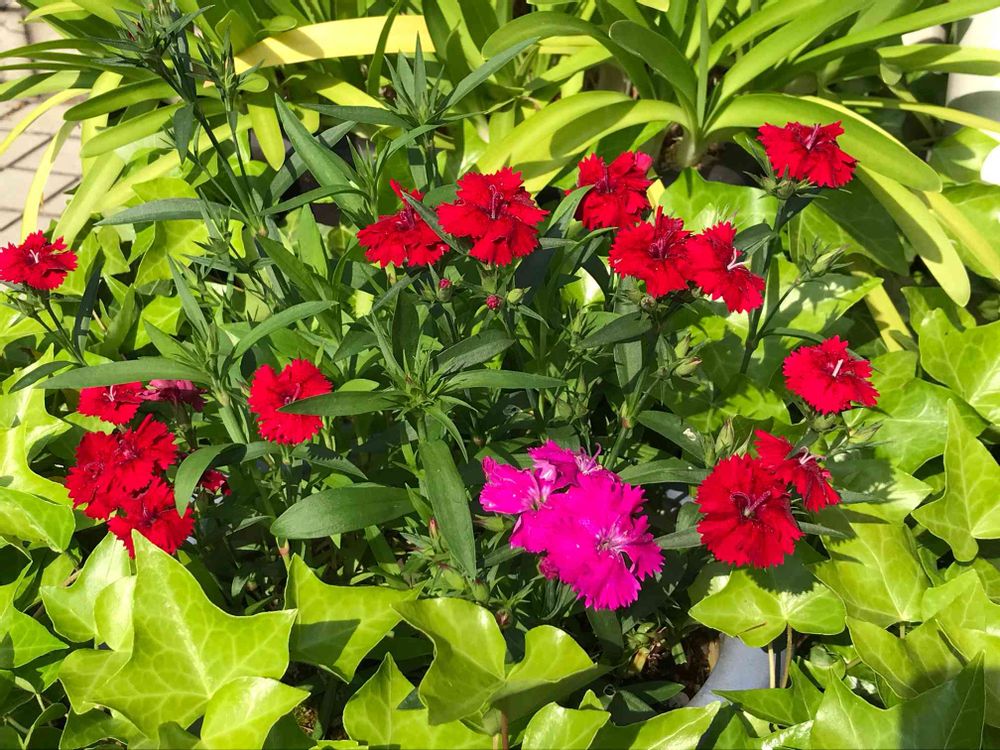 久しぶりに咲いたセキチク。周りのヘデラに囲まれ、赤が映えます!
