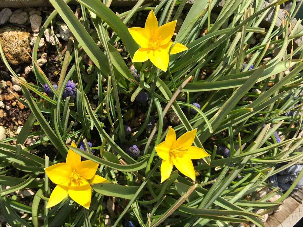 黄色い原種チューリップの中からムスカリさんがチラホラ見えて可愛い💕