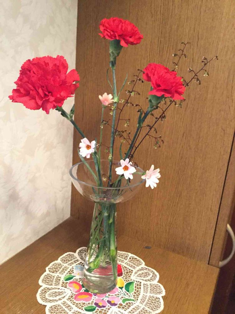 いいね、ありがとうございます。カーネーションも素敵だけど、花瓶やマットも素敵です。ハイセンス💕