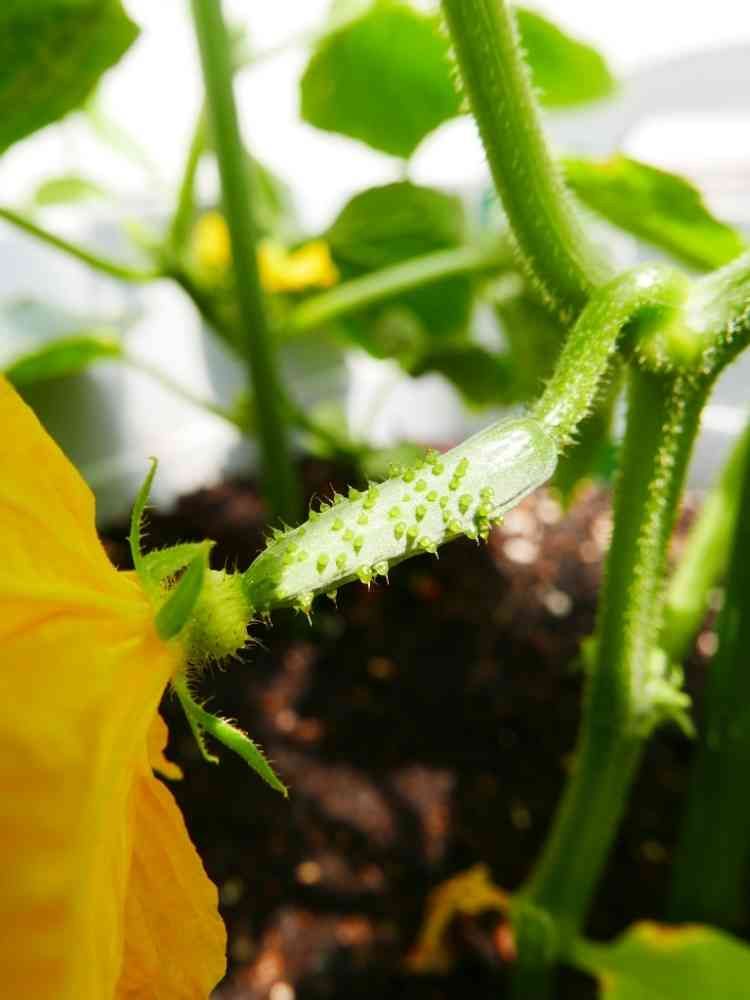 花の後ろにちいさなきゅうり。イボイボも光に当たると少しすきとおってる。