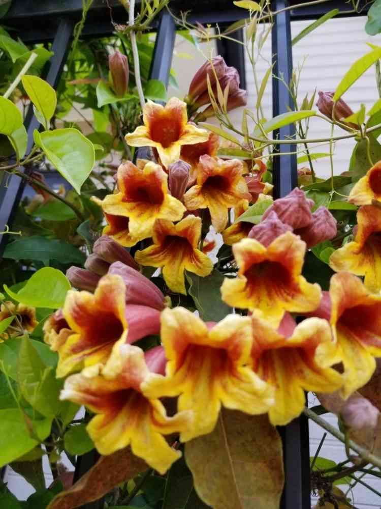 散歩途中でみつけました。ラッパのような花、花の長さ5センチくらい、お家の垣根になっていました。