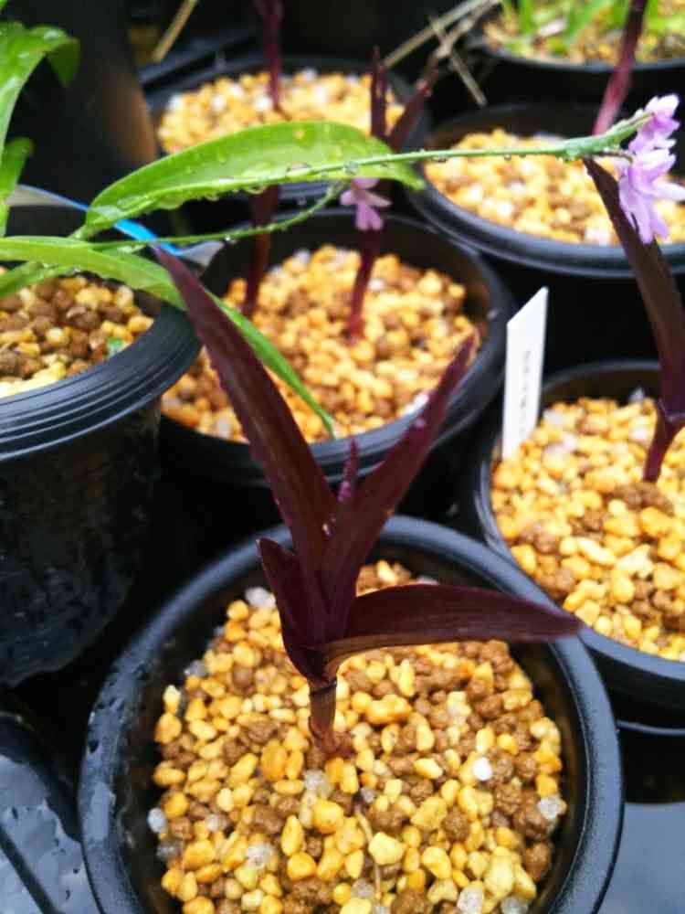 山口産のカラス葉カキランです。産地や個体によってはあっという間に褪色して緑になってしまう(暗む)ものもありますが、本種は黒紫のカラス葉が長く楽しめます。