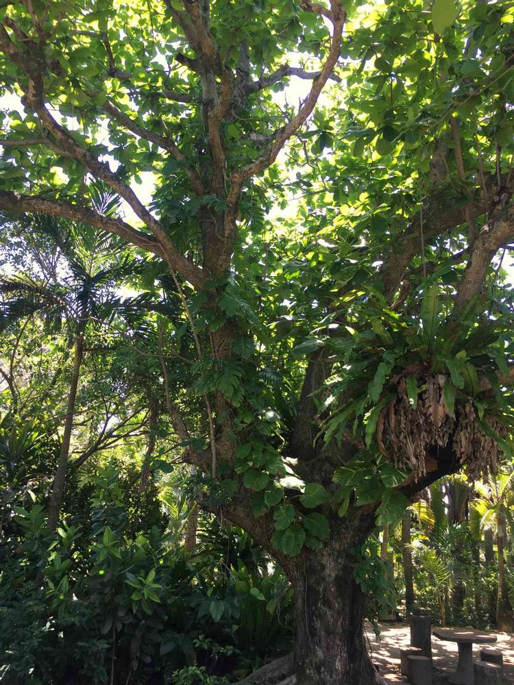 コバテイシという木に、オオタニワタリとポトスとモンステラが絡みついてる。