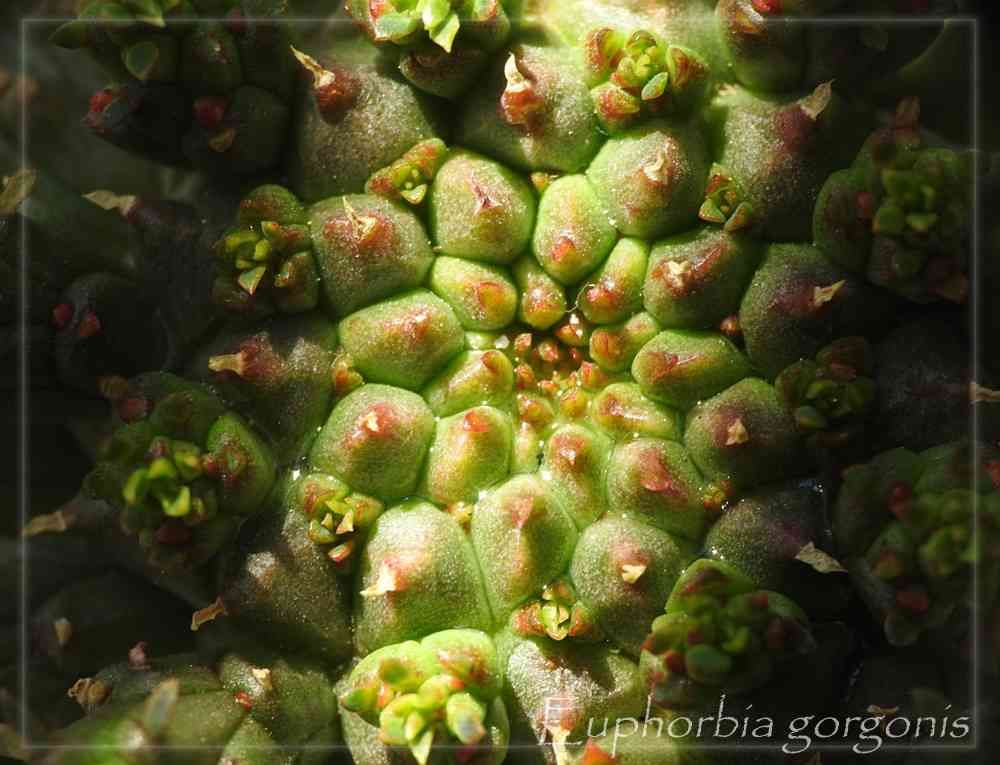 ユーフォルビア・ゴルゴニス(金輪際)。中心部をアップで見ると、謎の生き物かエイリアン。