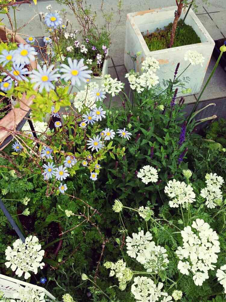 ブルーデイジー、オルレア、サルビアカラドンナ、宿根バーベナ。そしてギカンチュウムの蕾😁