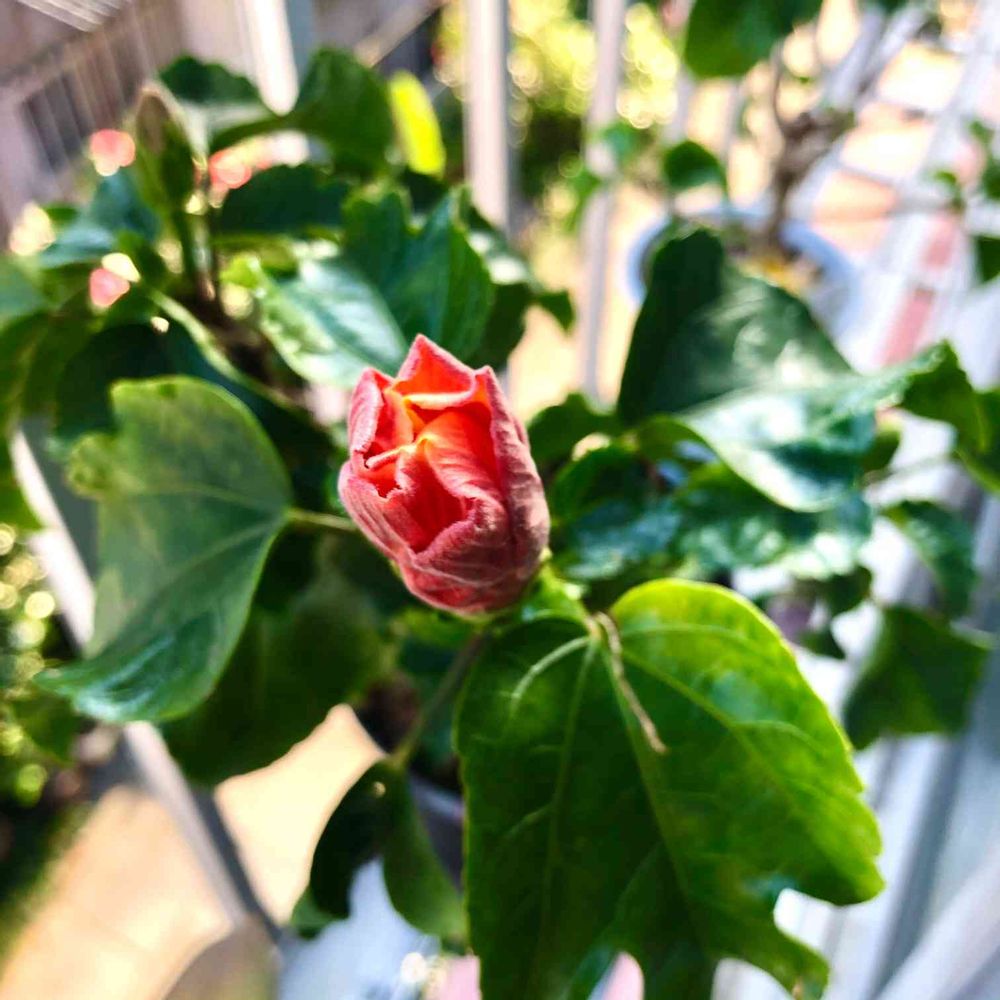 おはようございます。ハイビスカス、窓際で膨らむつぼみ🌺