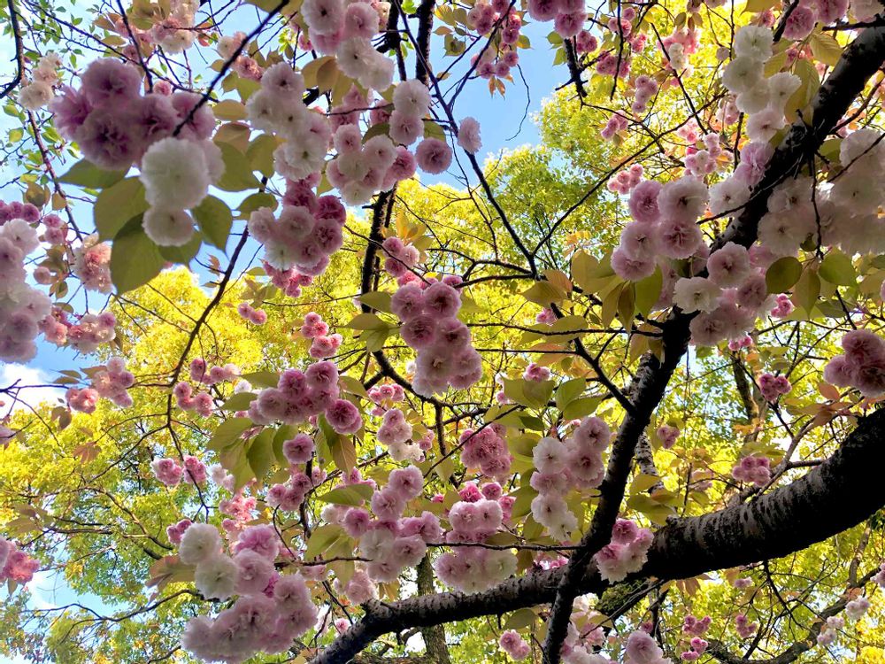 ピンクや白のまん丸の八重桜が可愛いね🌸