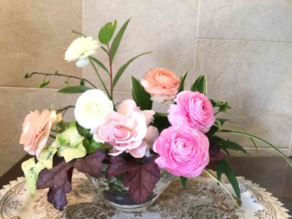 薔薇とラナンキュラスはお庭で丹精込めて作った物なんです。何時も頂くんです。
