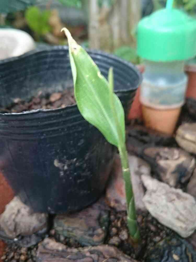 生姜の葉が広がってきました。後ろのポッドはバジルの種子を蒔いています。