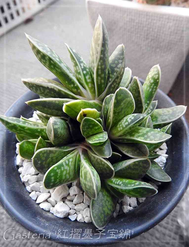 えーと。ことガステリアの斑入りや色変化の用語は、わかりやすく説明してくれるところが少なくて困惑中。紅摺墨子宝錦……この呪文みたいな名前を解読すると、紅は、寒くなると赤っぽく紅葉することを指すみたい。これも何となく赤くなったけど、今では緑に戻りました。摺墨というのは、色素が薄い斑や筋が入る斑入りに対して、ふつうより色の濃い黒っぽい緑の筋がはいることみたい。錦はご存じ斑入り。