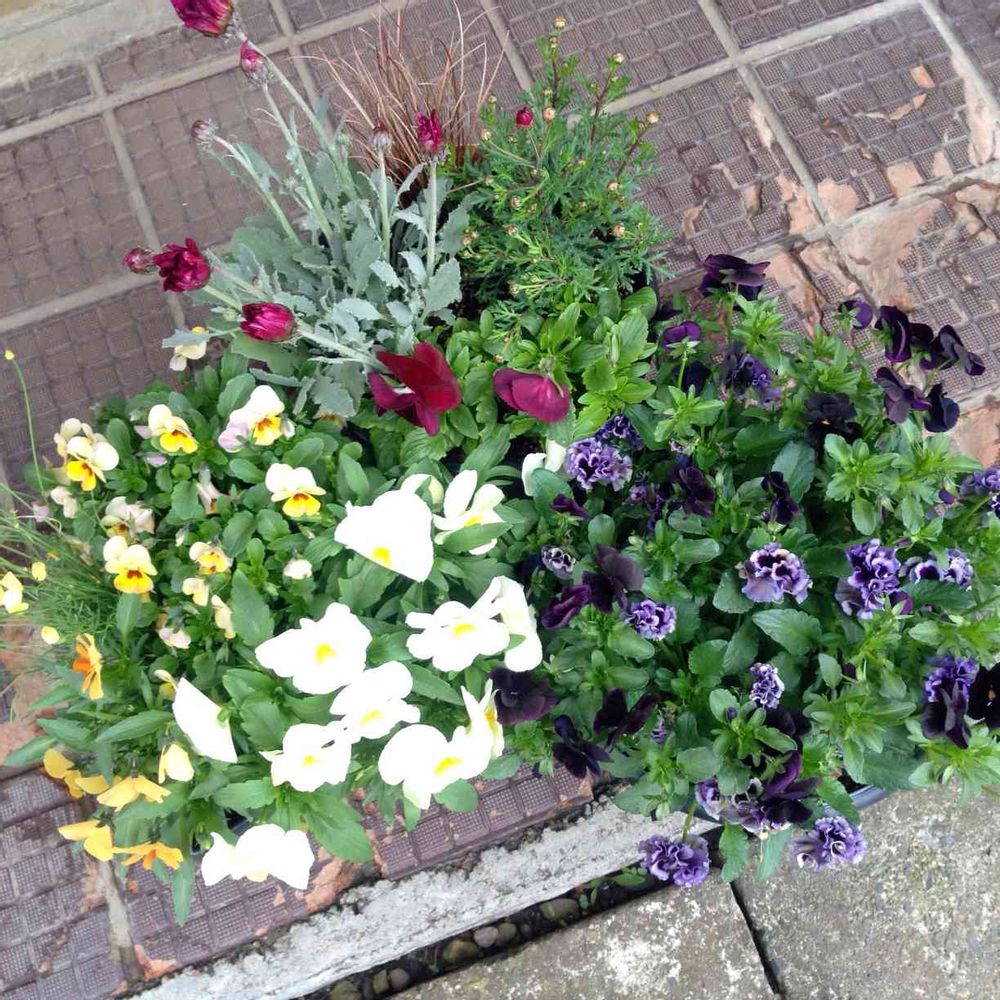 いろんな色を組み合わせてひと鉢にするセンスは無いので、おおよその色別に作った寄せ植え3つの集合でした😅