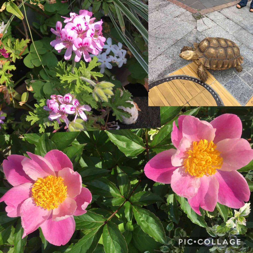 この暑さで昨日まで硬い蕾だったシャクヤクが今朝二つとも咲きました。ローズゼラニウムも咲き、賑やかになってきました。近くの商店街に🐢陸亀を散歩させている人がいて驚きました。ゴエモンちゃんというらしいです。犬のリードを片方の前足にかけ、器用に引っ張って、歩く方向を変えていました。そのうち、ワニに会うかもしれません。^o^。