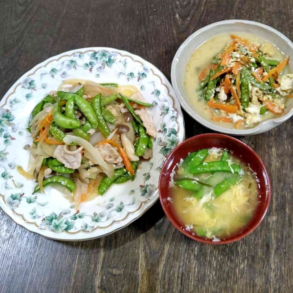 本日の夕食は、本日収穫した絹さやえんどうで😋