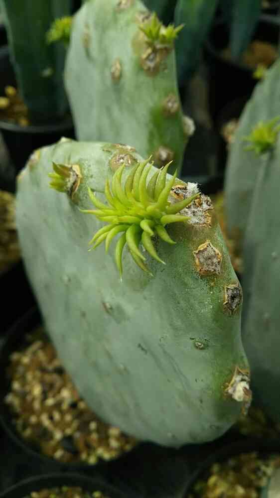 小型の団扇サボテンは、そのままの形で生えてくるけど、大型の接ぎ木に使えるこの品種は小さいうちには葉っぱ付きで育つよ😄