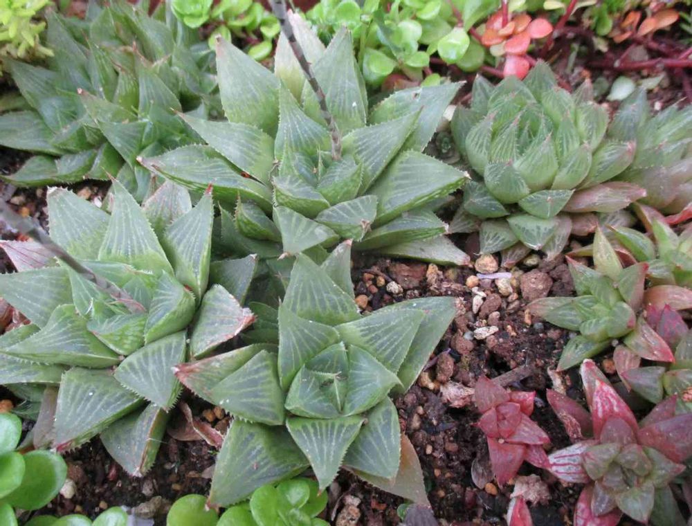 半円孤形の3段鉢棚を囲うように、以前温室で使用したパイプの一部で枠組みを作り、それに透明ビニールシートで包んで温室ごときの形にしたもので、その棚の下や手前のスペースにセダムやハオルなどを地植えして冬を越させたもので、元気なもんです。