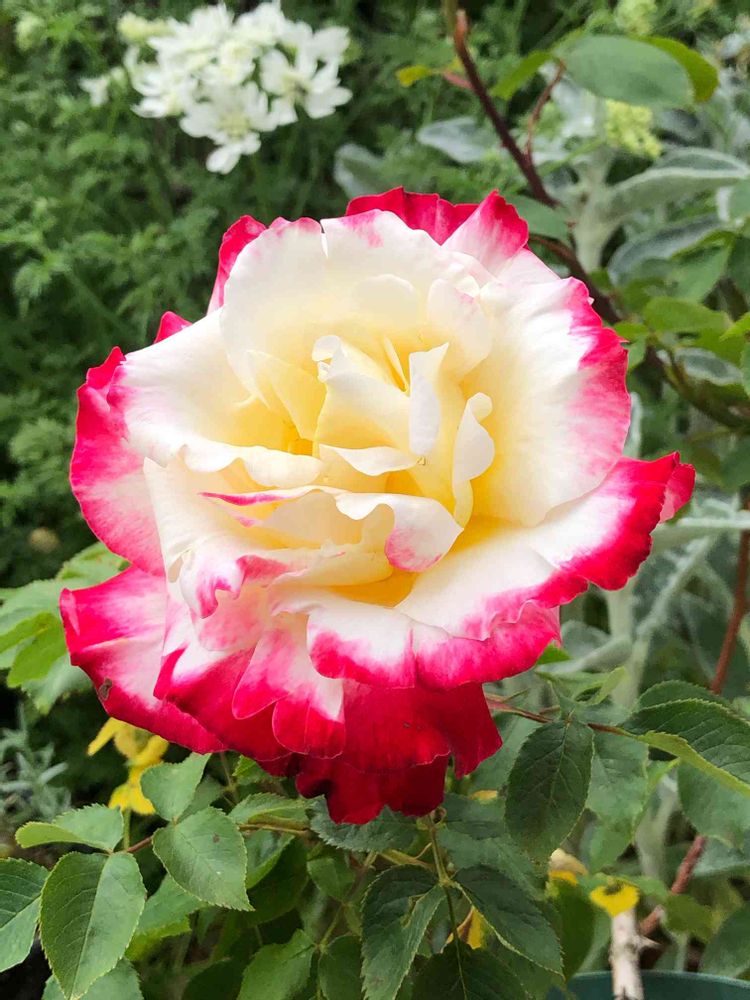 花芯がクリームで白い花びらに赤い覆輪たまりせん🥰