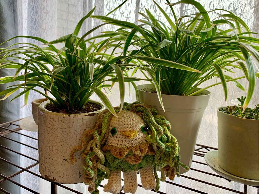 願いを込めてアマビエさん編みました。髪型がちょっと似ているような気がするシャムさんたちと一緒に、