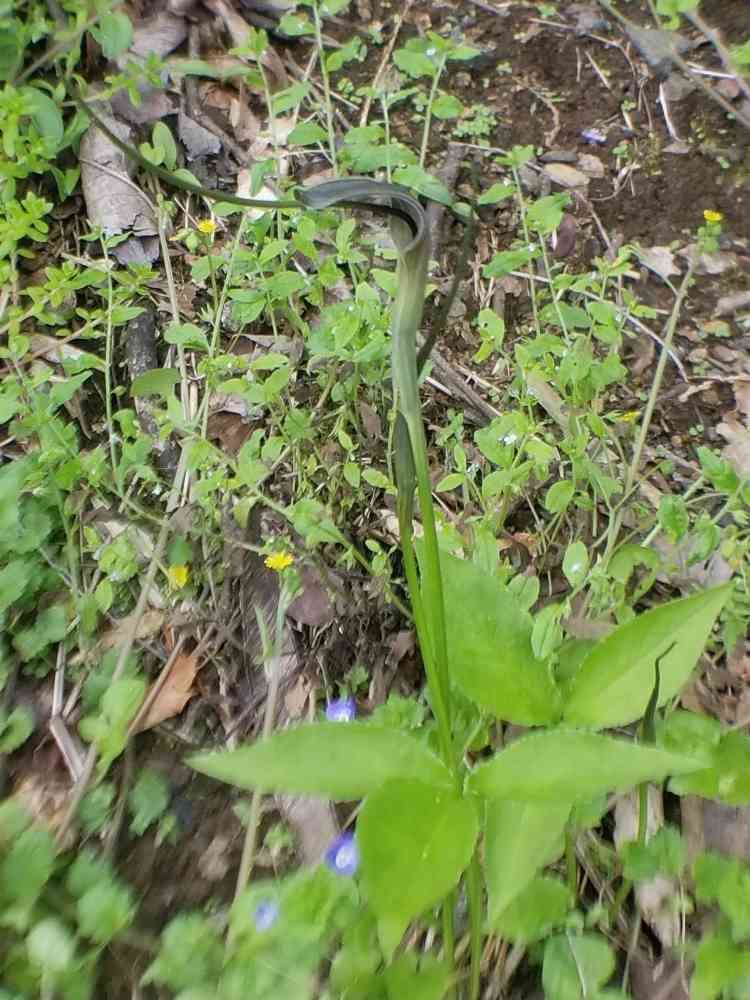 マムシグサの仲間のウラシマソウ…だけど、典型と葉が全然違うし、何か途中で花が分離してるような。これは一体何なんだろう?🧐