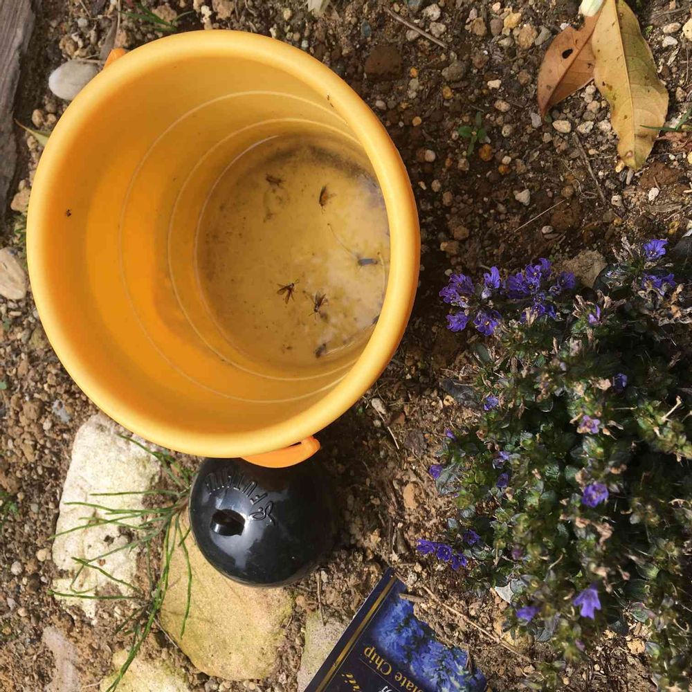 バケツに1/4くらいまでただの水を入れて、そこに台所洗剤を少々。それだけですよ。アジュガの近くに置いておくと勝手に飛び込んできます